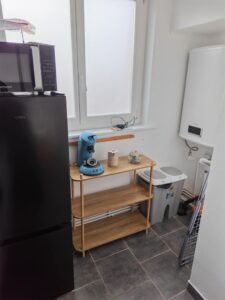 Vous avez un cabinet de toilette avec une douche. La cuisine est équipée, d’un frigo congélateur, plaque induction deux foyers, micro-onde grill, cafetière Senseo, bouilloire, aspirateur.