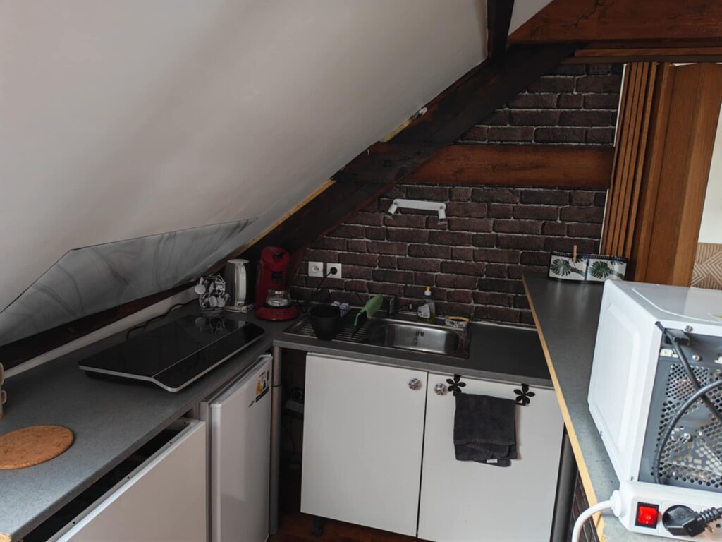 La cuisine est équipée, d’un frigo top, plaque à induction deux foyers, micro-onde, cafetière Senseo, bouilloire.