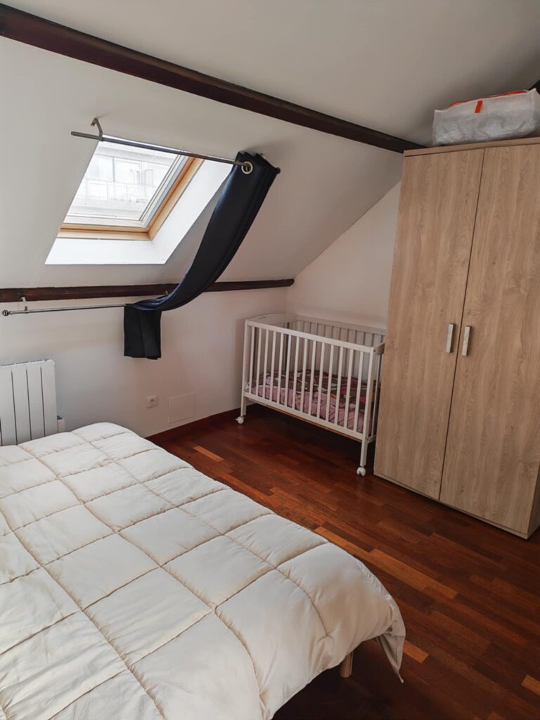 Appartement de 45m2 au sol mansardé situé au deuxième étage, pouvant accueillir de 1 à 3 personnes et un bébé (lit à barreaux) composé d’une chambre avec deux lits 90/200, d’une armoire, tables de chevet et sa salle d’eau avec toilette, douche et évier.