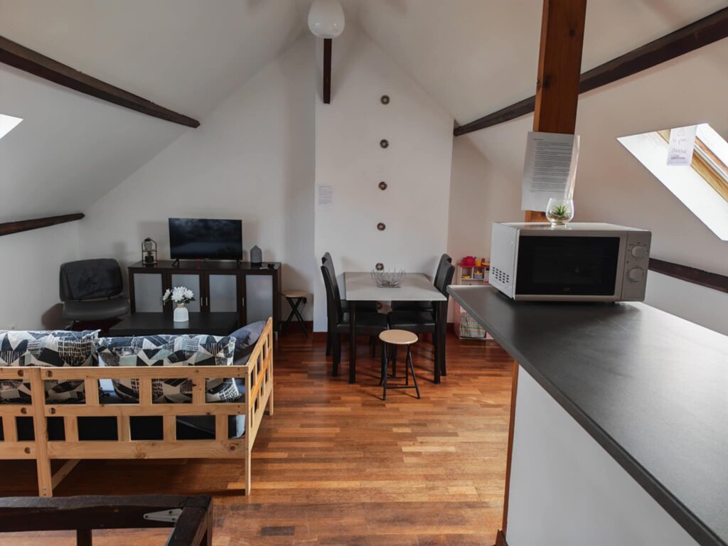 Vous y trouverez aussi un salon séjour avec un canapé banquette lit qui peut accueillir 1 enfant ou 1 adulte, et une table à manger avec quatre chaises, et deux tabourets un buffet contenant des jeux de société et livres pour vous divertir.